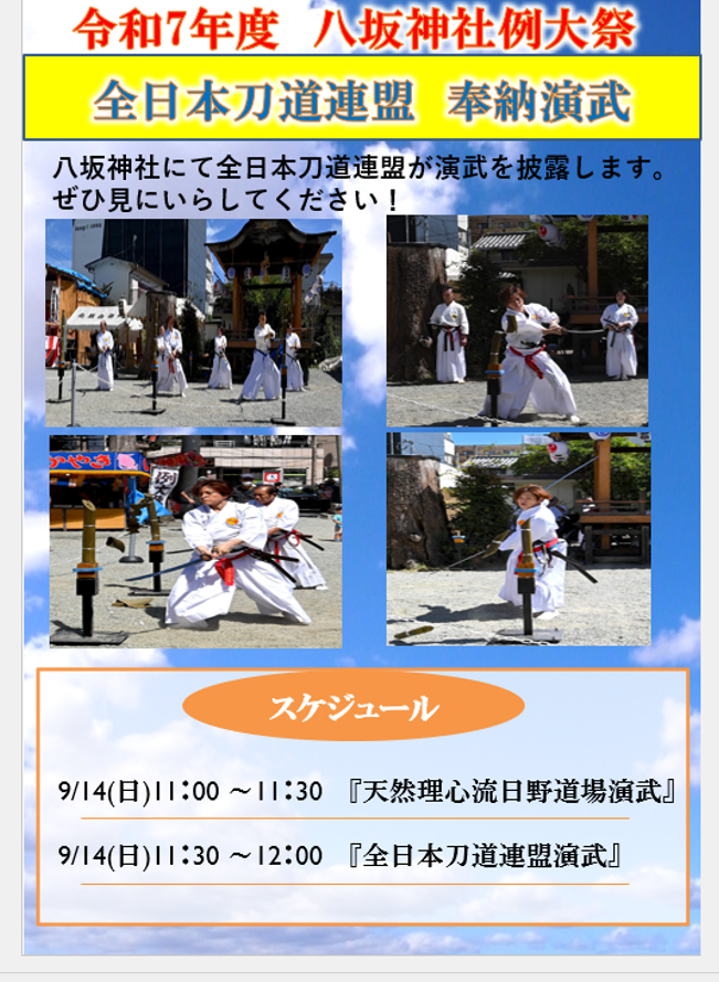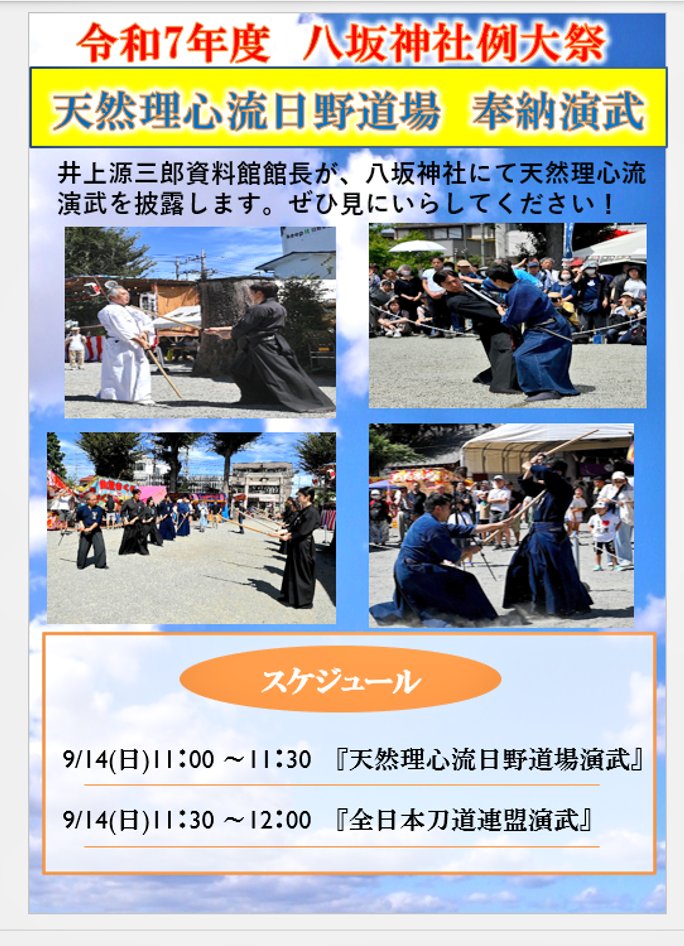 【令和7年八坂神社例大祭奉納演武】 お知らせ稽古日 2025.08.21 日野市八坂神社例大祭にて『八坂神社奉納演武』を行います✨令和7年9月14日(日)11:00~天然理心流日野道場11:30~全日本刀道連盟井上源三郎資料館館長も参加☺️ 御神輿や屋台も出るお祭りです🤗ぜひ、日野市へお越しください😌