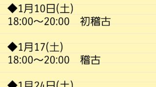 お知らせ稽古日 【令和8年1月の稽古日】 【 1月稽古日】1月10日(土) 18:00~20:00初稽古1月17日(土) 18:00~20:00稽古1月24日(土) 15:00~17:00稽古 2025.12.04 お知らせ稽古日