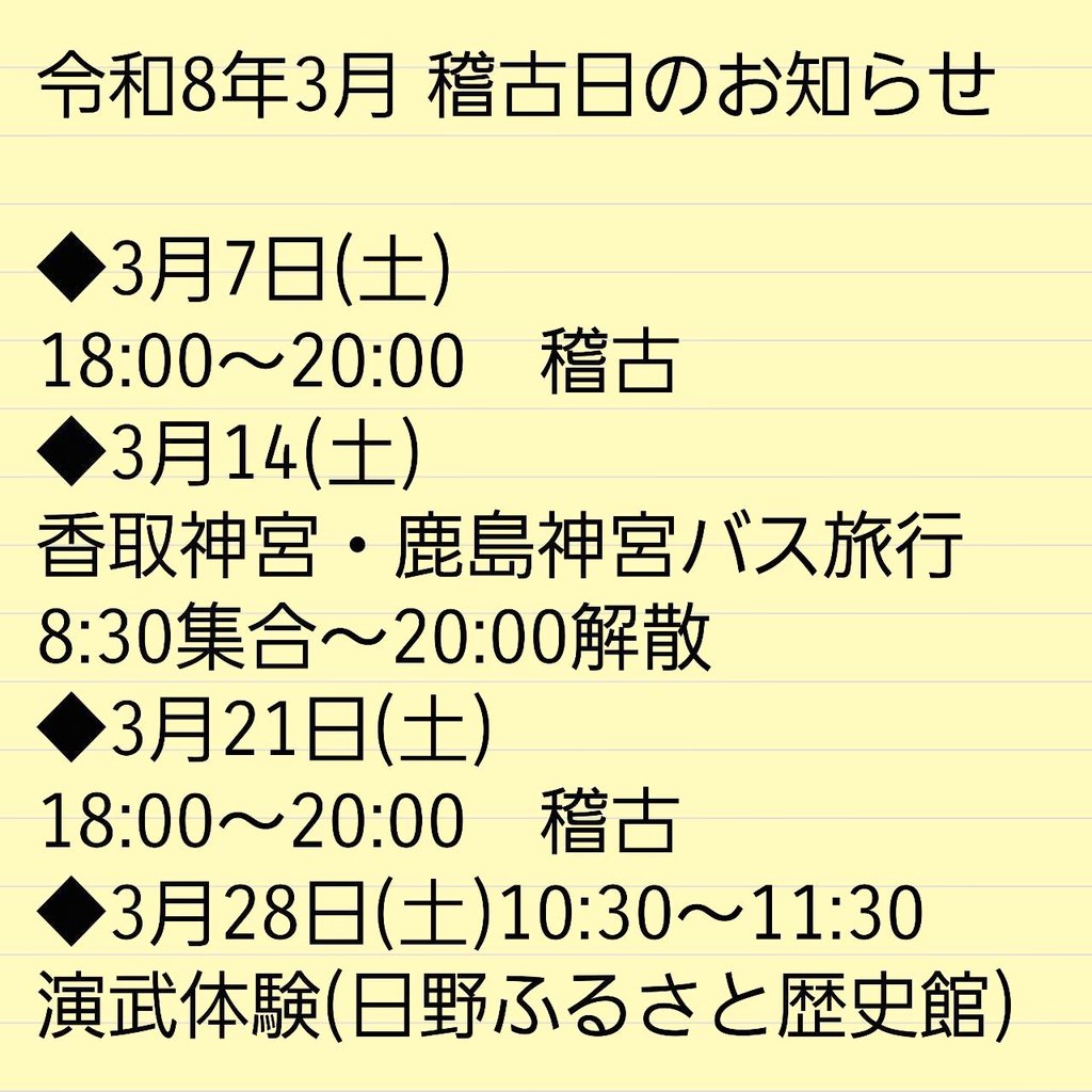 【3月の稽古日】 お知らせ稽古日 2026.02.20 【3月の稽古日】3月7日(土)18:00~20:00 稽古3月14日(土)日野道場日帰りツアー3月21日(土)18:00~20:00 稽古3月28日(土)10:30~11:30 新選組のふるさと歴史館にて演武体験